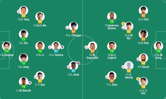 中場:10-杰西·林加德(F)、41-黃度允(87'7-鄭承原)、29-柳在文(59'8-李勝模)
